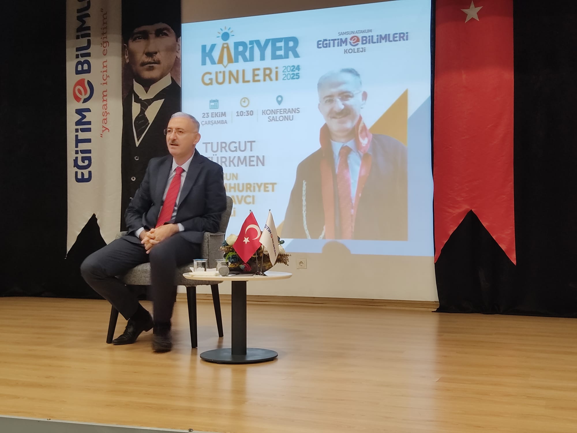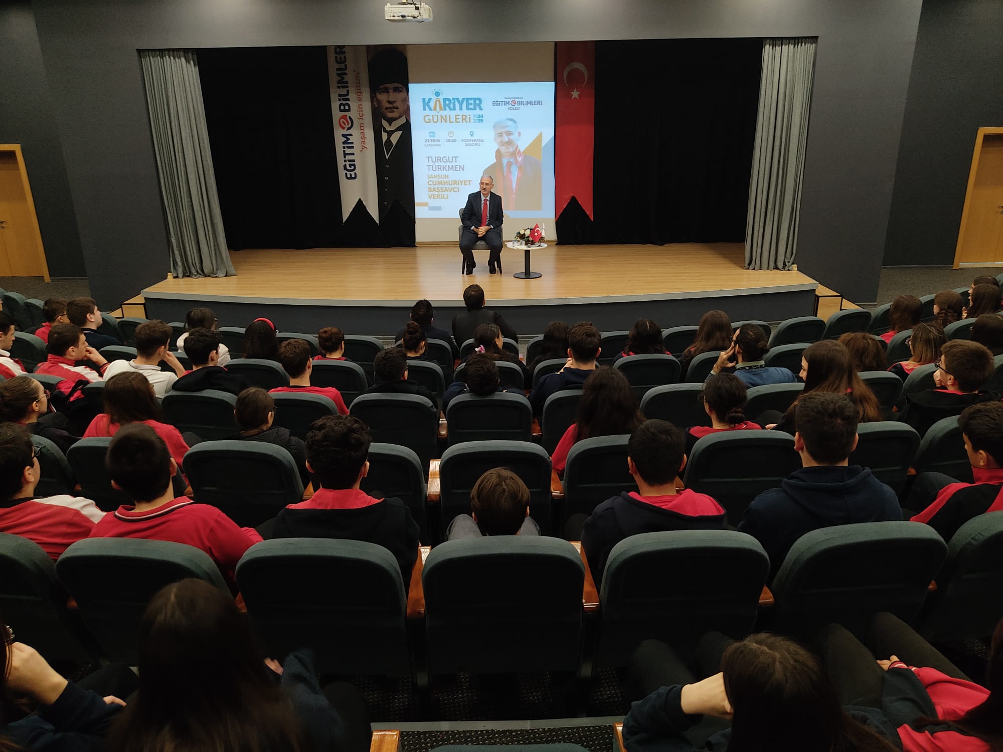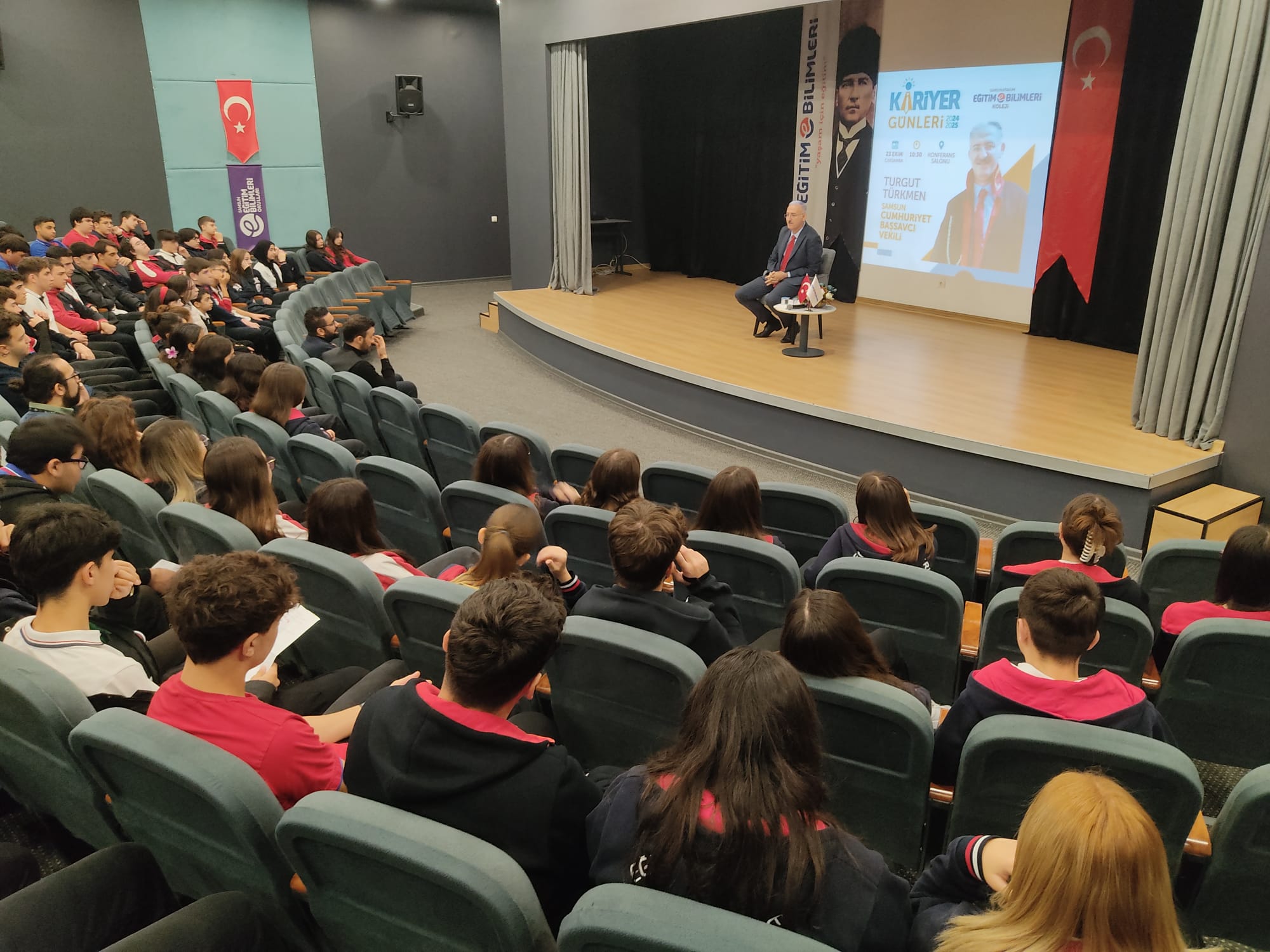 Kariyer günlerinde Adalet sisteminin önemli temsilcilerinden Samsun Cumhuriyet Başsavcı Vekili Turgut Türkmen ile bir araya geldik. Kariyer yolculuğunu, adalet ve hukuk alanındaki deneyimlerini öğrencilerimiz ile paylaşan ve hukuk alanında kariyer yapmayı düşünen öğrencilerimizin soru cevap yaparak fikir alışverişinde bulundular.