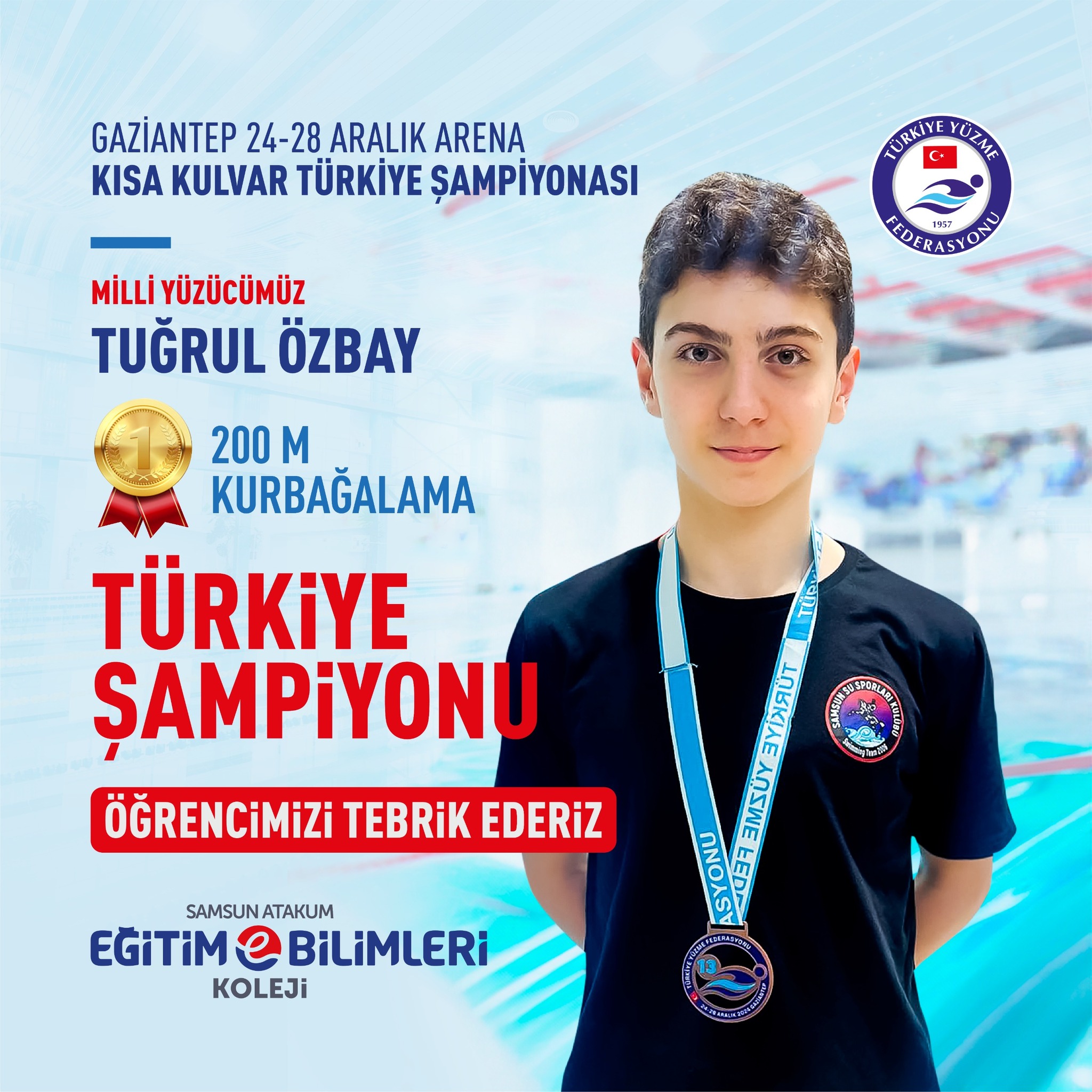 Okulumuzun Milli Yüzücüsü Tuğrul Özbay Gaziantep’e düzenlenen 24-28 Aralık Arena Kısa Kulvar Türkiye Şampiyonası’nda 200 metre kurbağalamada Türkiye Şampiyonu olmuştur. Öğrencimizi tebrik eder, başarılarının devamını dileriz.